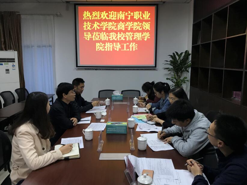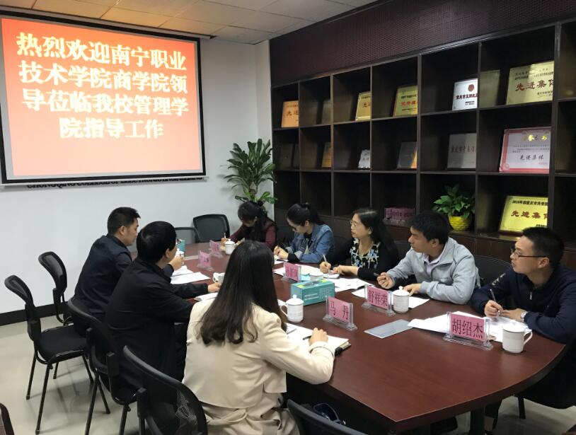 4月27日,广西南宁职业技术学院商学院党委副书记副院长孙新凤、商学院团委书记舒祥荣、学生工作处干事李林、商学院辅导员周斯斯、胡绍杰一行五人来到我校管理学院进行交流考察。